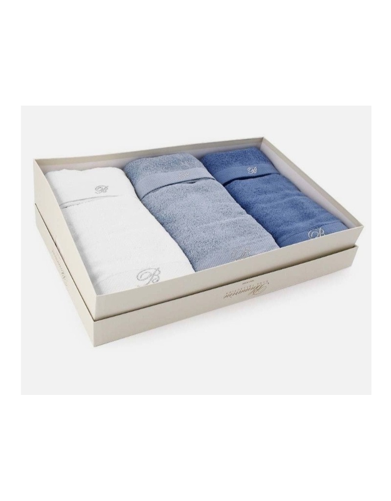 Set da 3 coppie 1+1 di asciugamani in morbida spugna di cotone idrofilo con logo Blumarine in cristalli Swarovski, in 3 diversi colori.