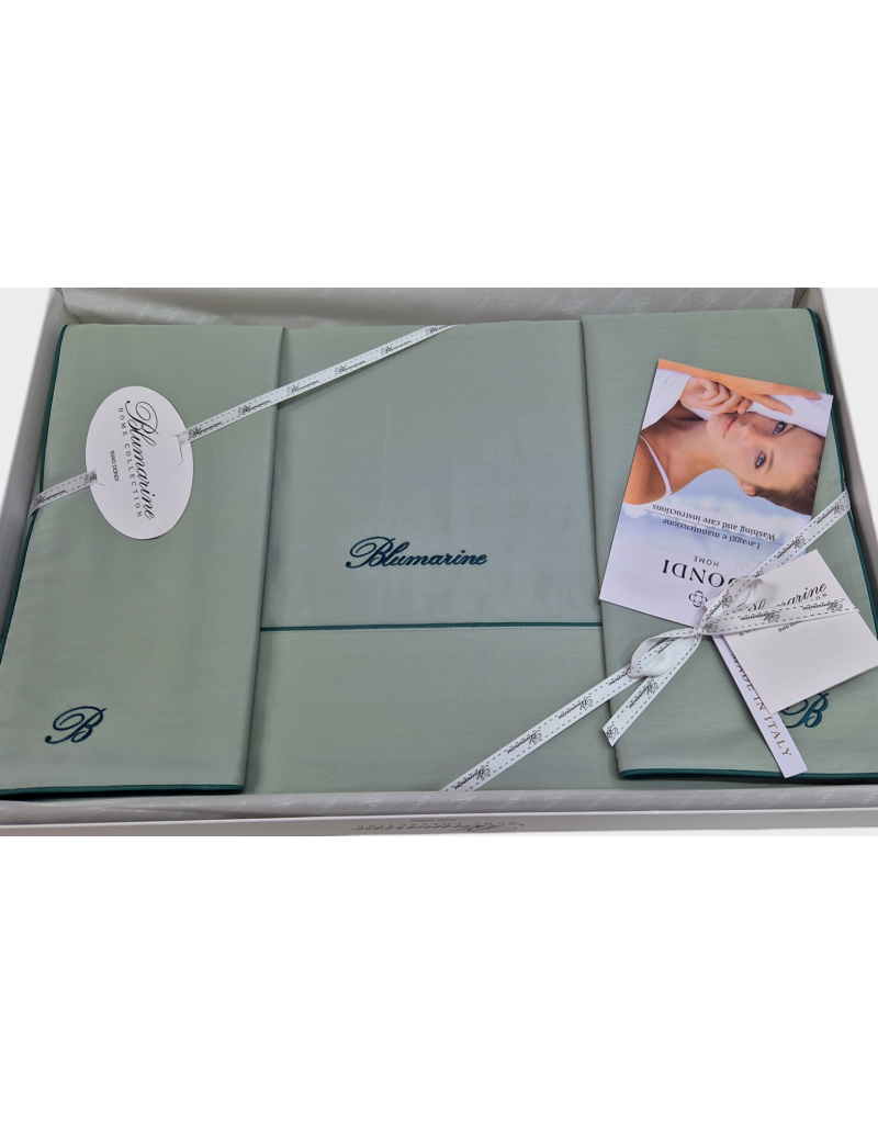 Completo Lenzuola matrimoniale in raso di cotone tinta unita con profilo a contrasto, federe a sacchetto con monogramma B ricamato, lenzuolo sopra con profilo colorato inserito sulla balza e logo Blumarine ricamato.