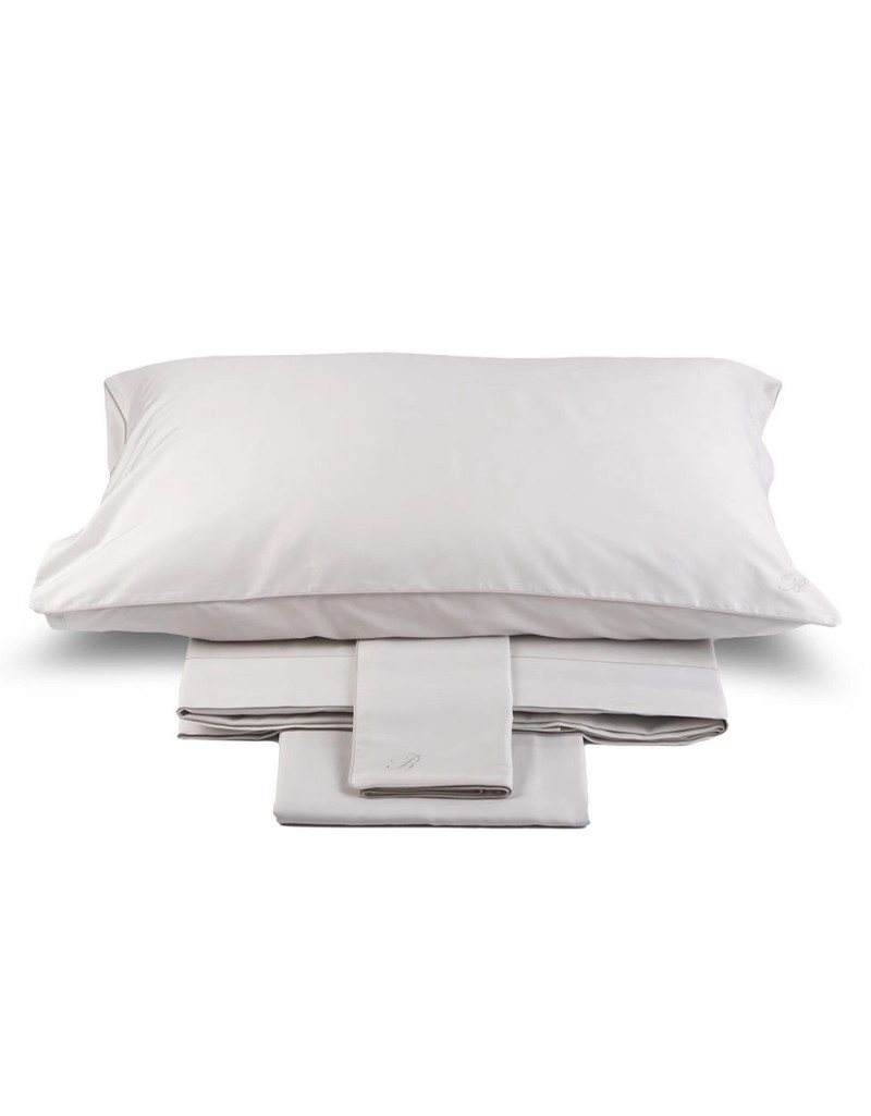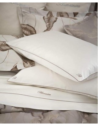 Completo Lenzuola matrimoniale in raso di cotone tinta unita con profilo a contrasto, federe a sacchetto con monogramma B ricamato, lenzuolo sopra con profilo colorato inserito sulla balza e logo Blumarine ricamato.