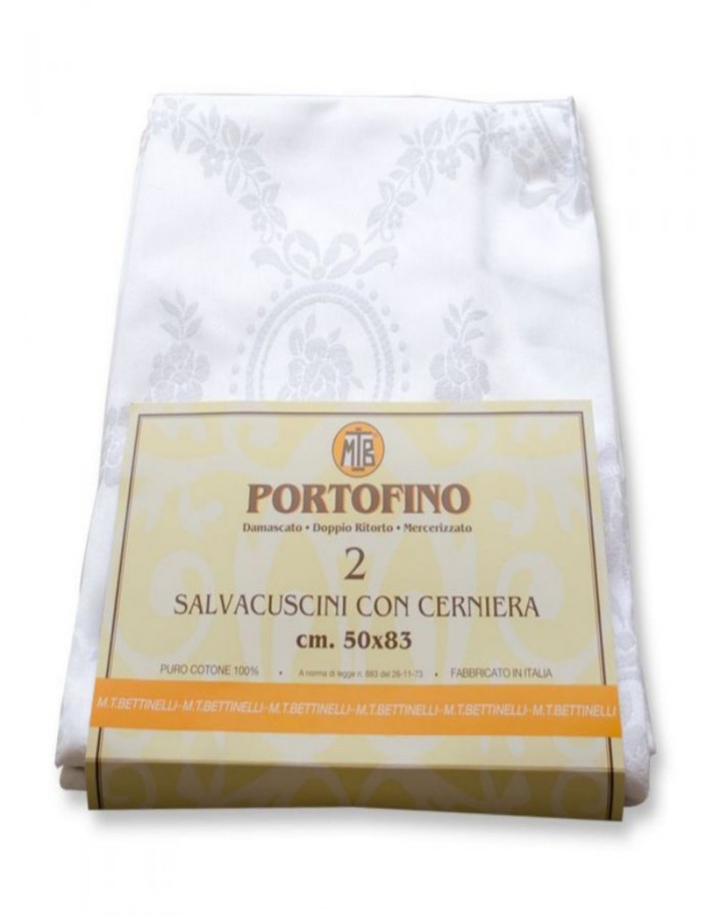 La confezione comprende un Set di 2 federe damascate con zip. Le federe sono di colore bianco ottico e sono di puro cotone damascato, doppio ritorto, mercerizzato. Cotone anallergico, antiacaro. Lavabile a mano o in lavatrice. Prodotto in Italy. Misure 50 x 83 cm.