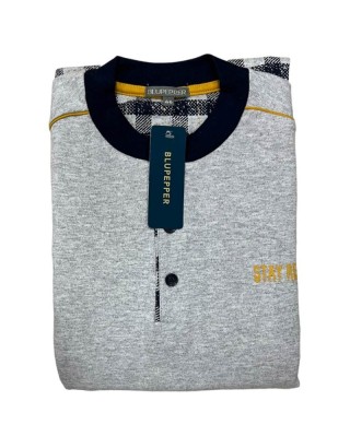 Pigiama uomo serafino, maglia con toppa sulle maniche e pantalone in tinta unita con polsino.
