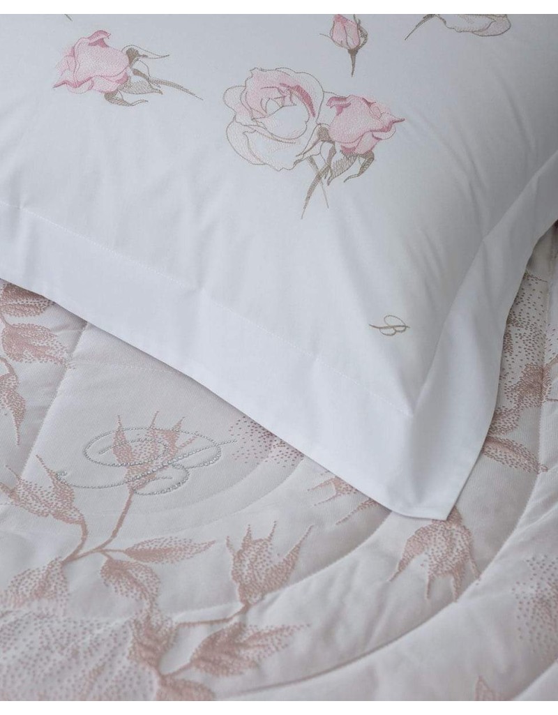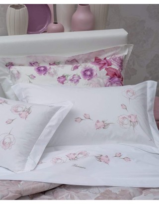 Completo lenzuola matrimoniale in percalle di cotone con ricamo piazzato su lenzuolo e federe.