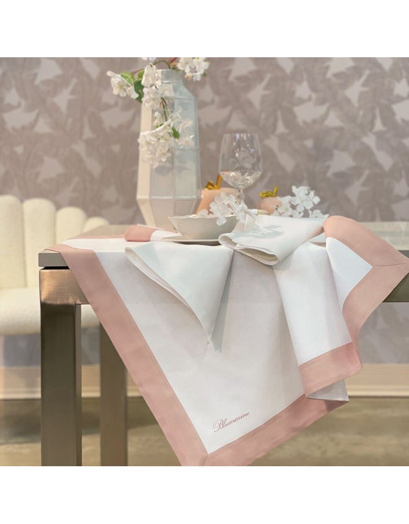 Tovaglia per 12 posti extra tinta unita bianca con bordo colorato in 100 % lino rimesso in applicazione alto 9,5 cm, logo Blumarine ricamato in tono con le fasce