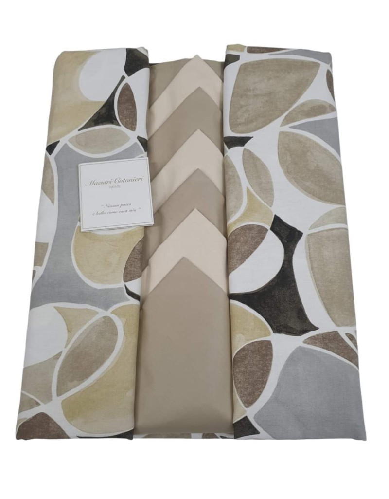 Il raffinato servizio da tavola composto da tovaglia e tovaglioli è realizzato in puro cotone.