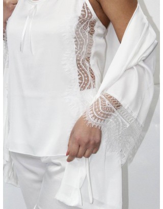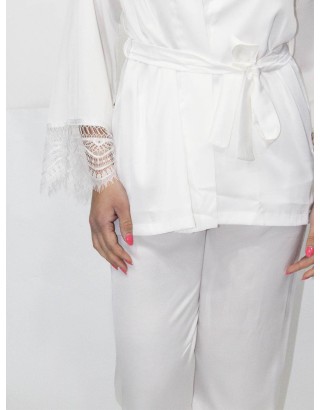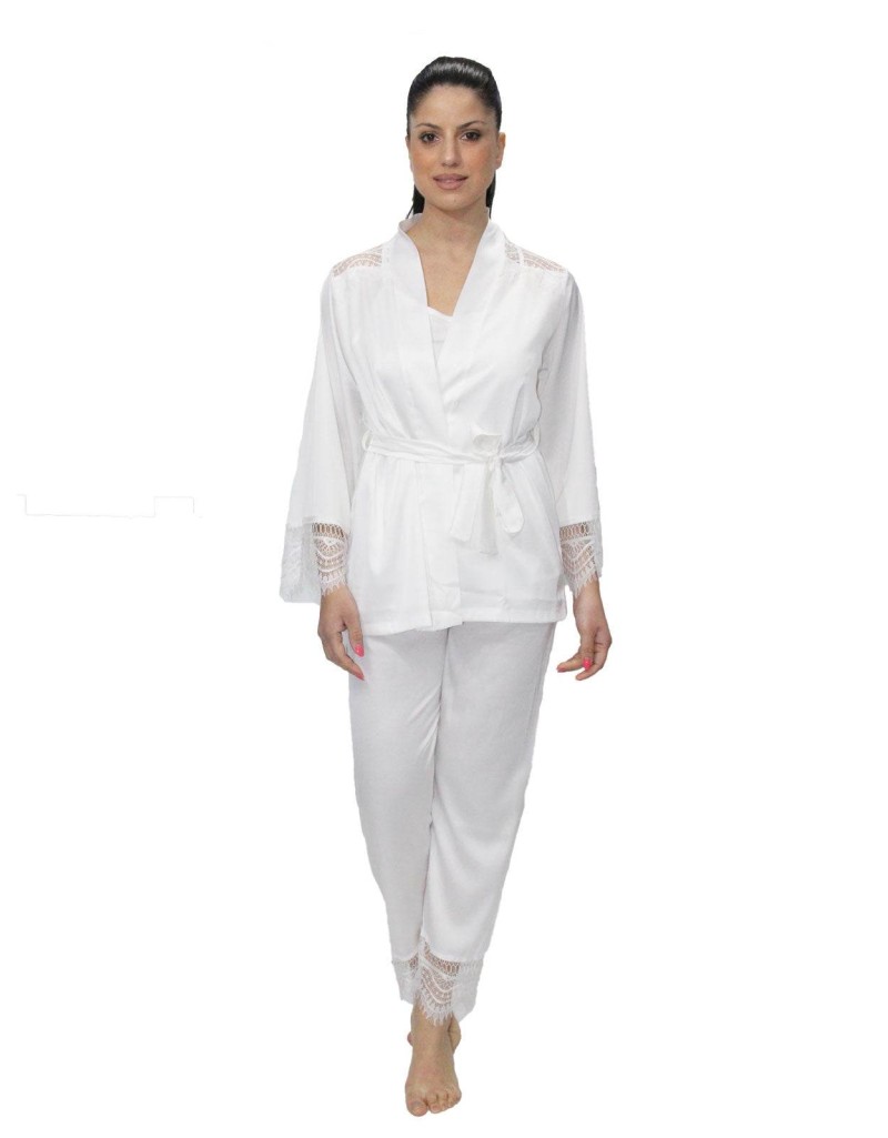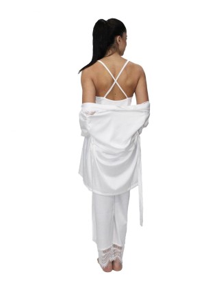Eleganza e raffinatezza si incontrano nel completo sposa Maestri Cotonieri, composto da pigiama e kimono coordinati. Realizzato in un delicato colore seta, avvolge il corpo con morbidezza e leggerezza, perfetto per i momenti intimi del giorno più speciale.