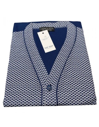Pigiama cardigan in jersey di cotone, fantasia classica con due tasche. Maglia tutta aperta con allacciatura a bottoni senza polsini.