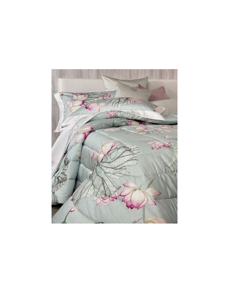 Trapunta invernale matrimoniale con stampa all-over su raso di cotone e logo Blumarine stampato nella trama.